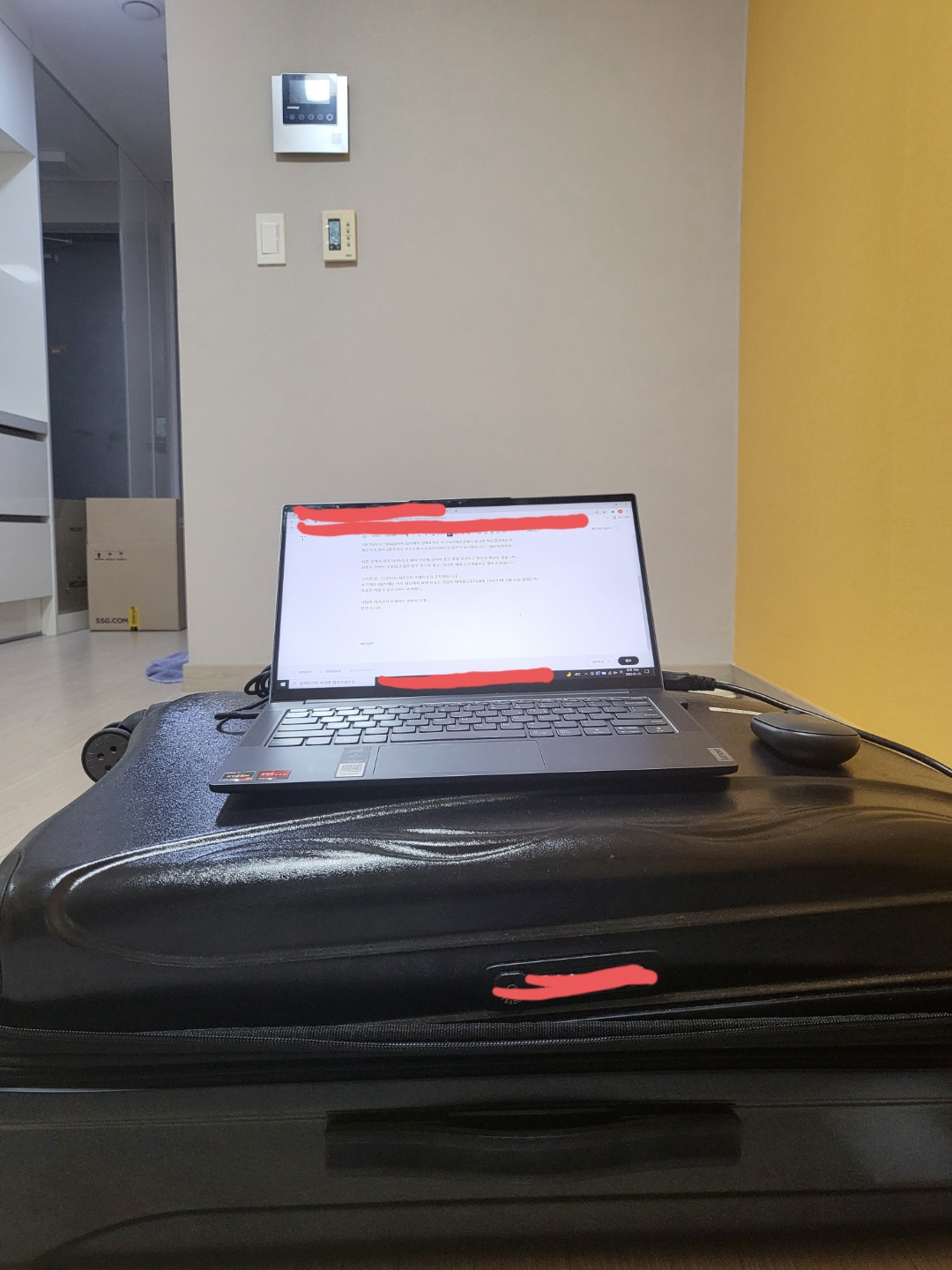 난방도 안돼서 구호의 손길(♡)로 받은 전기요 깔고.. 캐리어 위에 노트북 올리고 일하고 있습니다.
